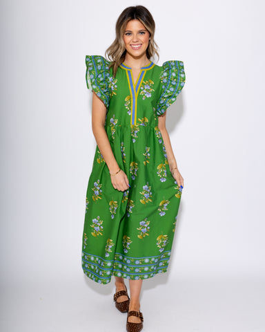 Timeless elegance meets effortless style in this pullover midi dress, set against a rich green background that beautifully showcases a framed flora...