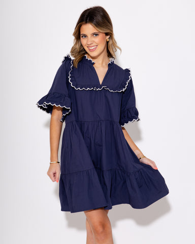 View full detailsChic Meets Sweet in This Navy Mini DressStep into effortless charm with this navy mini dress, featuring crisp white contrast scalloped stitching th...