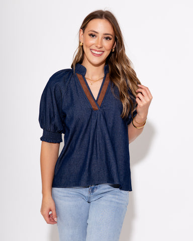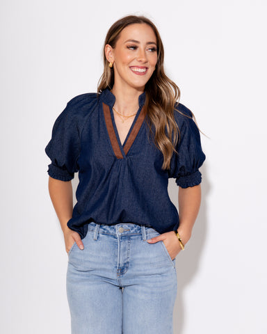 View full detailsElevate your casual-chic game with this structured denim top featuring a split neck and puff sleeves. The standout detail? A contrast tan suede ruf...