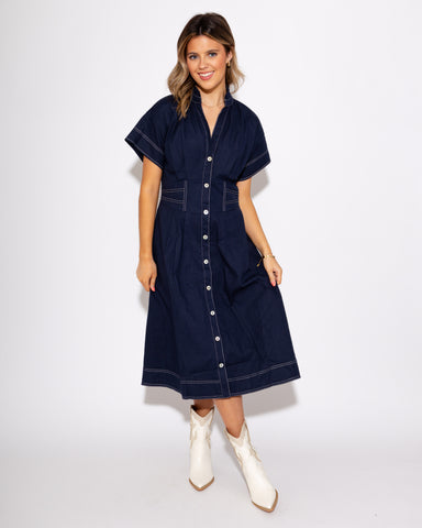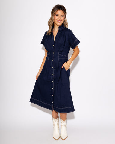 View full detailsElevate your wardrobe with this sophisticated navy button-down midi dress. The cinched waist with contrast white stitching creates a flattering sil...
