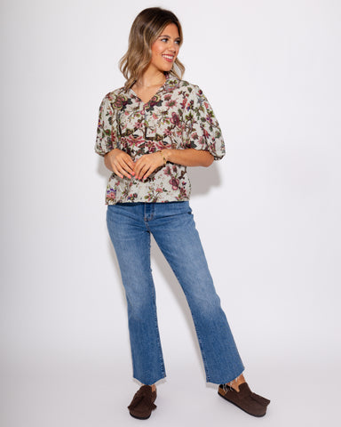 View full detailsPretty blooms and puffed sleeves? Yes, please! This sweet ruffle neck top dances with pink and green florals against a dreamy pale blue backdrop. T...