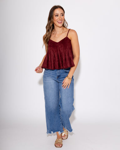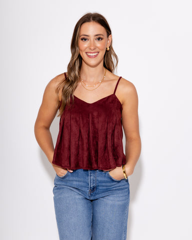 View full detailsElevate your layering game with this soft suede pleated cropped tank in a rich wine hue. Featuring adjustable straps and stretchy banding in the ba...