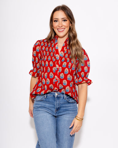 View full detailsMake a statement in this vibrant button-up blouse featuring a red background adorned with floral prints in blue stems and pale orange petals, all a...