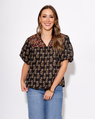 View full detailsAdd a touch of artisanal charm to your wardrobe with this black woven floral top. Featuring a textured woven panel across the chest in shades of re...
