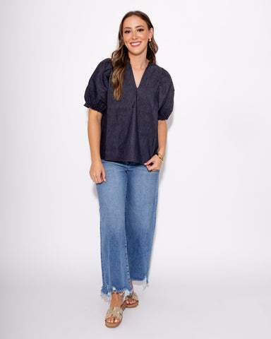 Elevate your wardrobe with the Navy Duo Top, featuring a chic blend of textures. The body’s smooth poplin contrasts beautifully with puff sleeves c...