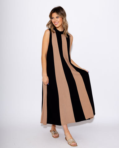 View full detailsElevate your style with the Mono Stripe Maxi, featuring bold vertical chunky colorblock stripes in black and cream. This sleeveless maxi dress offe...