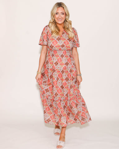 Step into effortless elegance with our Smocked Waist Tiered Print Maxi Dress. This stunning maxi dress features a smocked waist for a cinched, flat...