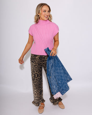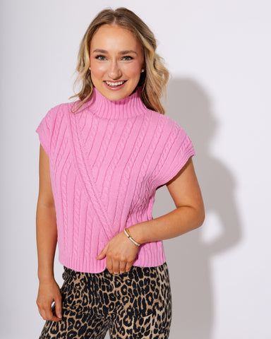 Elevate your transitional wardrobe with this sophisticated cable knit sweater in blush pink. The sleeveless silhouette and refined turtleneck creat...