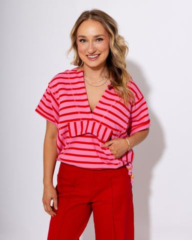 Elevate your everyday wardrobe with this sophisticated pink top, designed with striking white contrast detailing that frames the split neckline and...