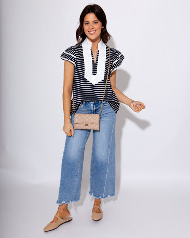 Navy and white striped perfection meets timeless elegance. This charming top features bold vertical stripes in navy and white, anchored by a striki...