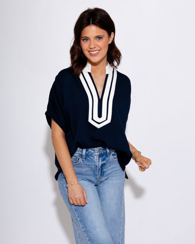 Elevate your everyday wardrobe with this sophisticated navy top, designed with striking white contrast detailing that frames the split neckline and...
