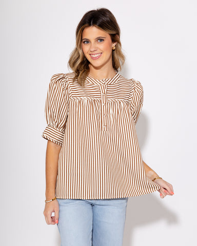 View full detailsSharp lines meet soft details in this soft brown stripe pattern pullover top. With structured short sleeves, a round neckline, and button-front clo...