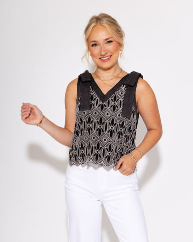 View full detailsDelicate details take center stage in this feminine sleeveless top, featuring a black backdrop adorned with white floral embroidery. The exposed st...
