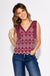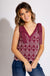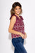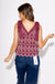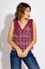 Delicate details take center stage in this feminine sleeveless top, featuring a burgundy backdrop adorned with white floral embroidery. The exposed stitch accents and V-neckline offer a handcrafted feel, while bow-tied shoulder straps add a soft, whimsical touch. Whether dressed up with trousers or paired with casual denim, it’s a standout piece with timeless charm.