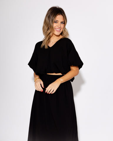 View full detailsEffortless chic in a coordinated duo. This black two-piece set features a pull-on midi skirt with an elasticated waistband, side pockets, and a sub...