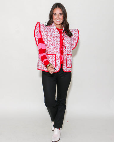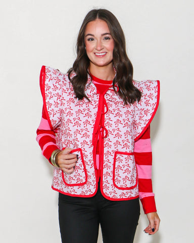 View full detailsBe bold and stylish with our Red Bow Vest featuring ruffled shoulders! The diamond quilted gilet adds texture and the contrast binding outlines the...