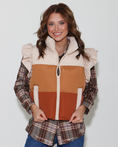 View full detailsBrave the cold in style with our chic Color Block Ruffle Trim Puffer Vest! Featuring a high neck and front zipper for extra warmth, this vest also ...