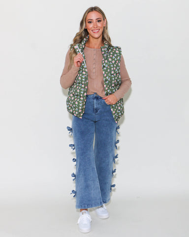 View full detailsBe a trendsetter with our Floral Print Front Zipper Puffer Vest in olive! This versatile vest is made with a front zipper for easy wear and feature...