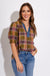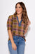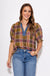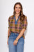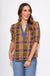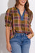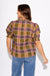 Bring a touch of playful sophistication to your wardrobe with this Puff Sleeve Plaid Top. Featuring a soft olive background with pops of purple, pale orange, and yellow, this top delights with its charming plaid pattern. The split neck is accented with a contrasting blue trim and a matching plaid neck tie, while tiny ruffle details along the neckline add a feminine touch. Short puff sleeves complete the look, making it a perfect piece for back-to-school or everyday styling.