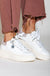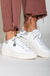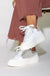 Presenting the SALLY sneaker - an embodiment of style and comfort. These sneakers feature a tall rubber platform, padded insole, vibrant-hued panels, and a color-block heel counter. Constructed from smooth, high-quality faux leather, the chic white body is accentuated by a contrasting nude minimalistic heel tab and a chunky rubber sole. The brand icon adds a cool touch to the shoes. Pair these sneakers with a slim-fitting suit for a sophisticated look.